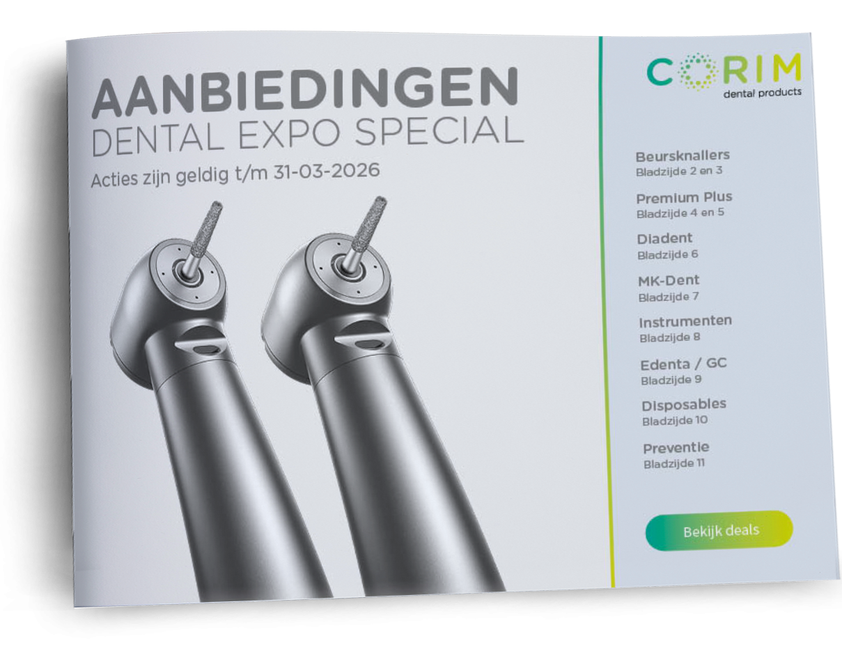 Wilt u altijd als eerste op de hoogte zijn van onze nieuwste aanbiedingen, acties en interessante promoties? Schrijf u dan in voor de Corim Dental nieuwsbrief! Zo mist u nooit een kans om te profiteren van scherpe deals en blijft u op de hoogte van het laatste nieuws binnen de dentale branche. Inschrijven is eenvoudig en gratis.